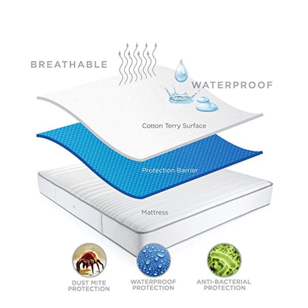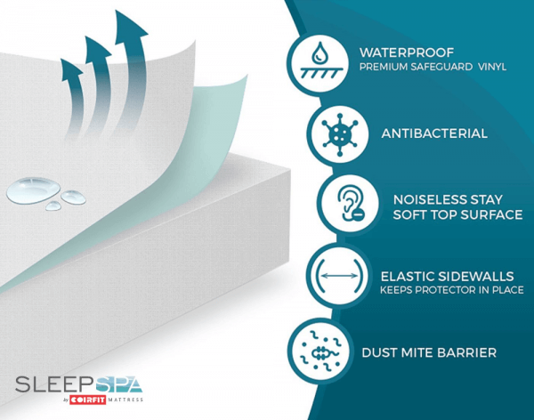 With a 2 in 1 advantage, Sleep Spa Cotton Terry Waterproof Mattress protector is the perfect solution to protect your mattress from stains, dust mites, allergens, and bacteria. We engineered our mattress protector to provide softness you can feel, and sealed in protection you can trust. It comes with a top cotton terry layer, poly fiber filling, and lamina inner cover.